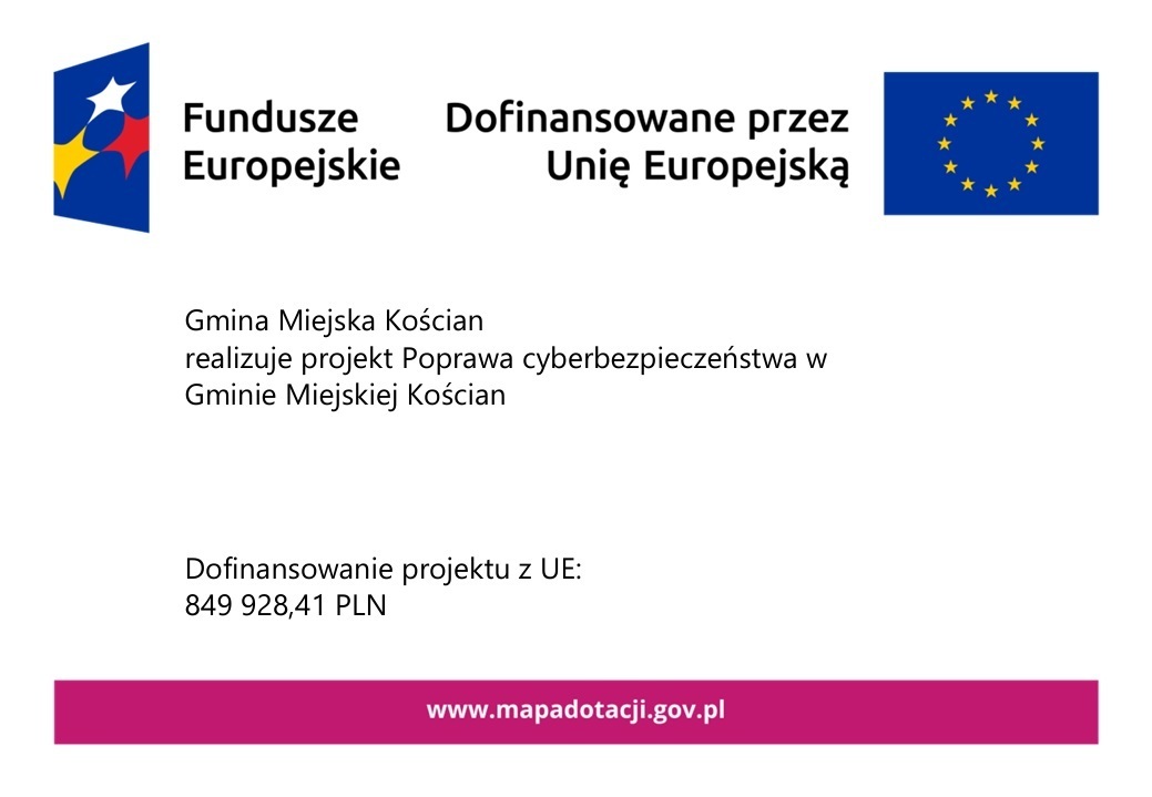 Poprawa cyberbezpieczeństwa Gmina Miejska Kościan realizuje projekt Poprawa cyberbezpieczeństwa w Gminie Miejskiej Kościan Dofinansowanie projektu z UE: 849 928,41 PLN